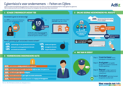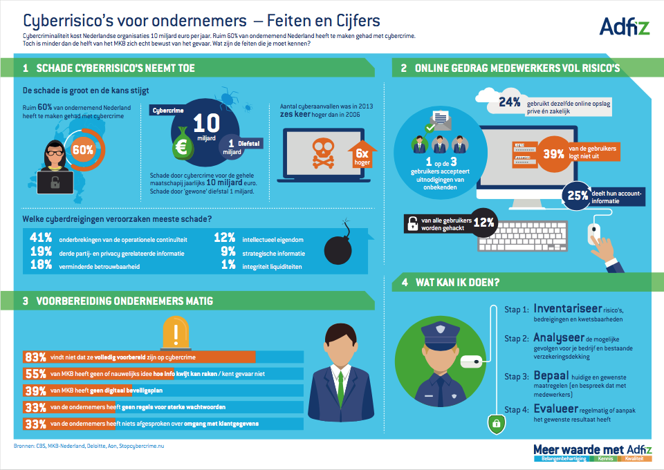 Minder dan de helft van alle MKB’ers is zich bewust van het gevaar van cybercrime. Welke feiten en cijfers moet je kennen? Finfin van Adfiz heeft ze in kaart gebracht in onderstaande infographic.